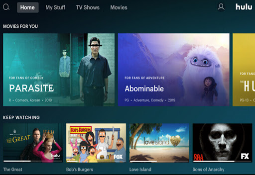 The dashboard displays shows Hulu thinks you will like front and center, with additional categories for popular shows and movies by genre. You can also search for shows by name.
