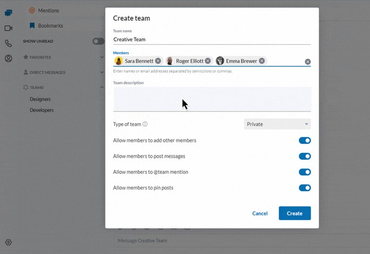 Another nice thing about the team messaging feature in RingCentral is that you control permissions for the chat space. It’s up to you to decide whether the team should be public or private, whether other members are allowed to add members, or whether other members can pin posts to the top of the chat.