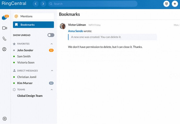 RingCentral also helps you organize your messages with pins and bookmarks. When you pin a message, it automatically appears at the top of a conversation at all times. This feature is particularly helpful for department-wide or company-wide team messages, since pins enable you to ensure that messaging guidelines and important announcements are visible to everyone in the chat.