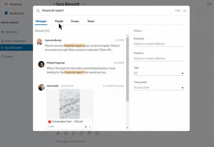 Helpfully, you can also filter your search by person or team, time or date, and whether messages contain images or shared files. Even if you only vaguely remember the details of the message you’re looking for, these filters make it easy to narrow down your search results quickly.