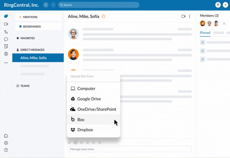 In addition, you can share files directly from cloud storage services like Box, Dropbox, OneDrive, Sharepoint, and Google Drive. You can also share files from these cloud services using the RingCentral app.