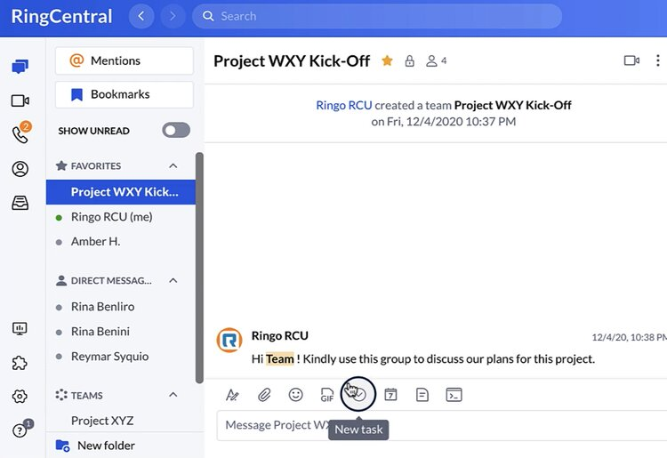While you can create tasks from scratch in RingCentral, you can also create tasks directly from messages. Just click on a message to create a new task, and the task description will be automatically populated with a copy of the message.