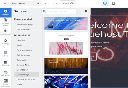 We found this to be much easier to use than WordPress’s standard site editor, although you still have access to the WordPress interface if you want to use it. WordPress’s editor makes it difficult to divide your site into sections with different backgrounds, and it’s even more difficult to arrange content side by side. The Bluehost editor makes these essential design tasks simple.