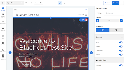 You can open Bluehost’s website builder from within your WordPress dashboard. The editor offers premade page sections, each of which includes multiple elements such as text boxes, image containers, buttons, and more. You can choose which elements to show and hide within each section, and there are several predefined layout options for each section.
