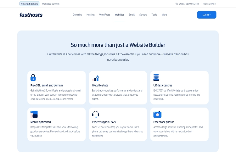 Fasthosts has a user-friendly website builder that’s backed by a suite of attractive features. All packages come with a free SSL certificate and domain name. There’s also 24/7 support and an excellent knowledge base on the website.