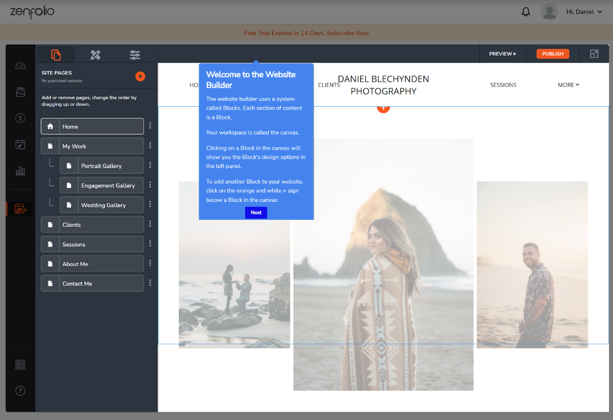 Getting started with Zenfolio is a very straightforward process. You don’t have to add payment details to access the 14-day free trial, although you will need to answer a couple of quick questions about your experience and goals before being guided through the website-creation process.