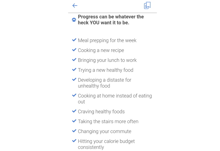 Noom points out some BS thinking patterns we fall into that undermine our efforts. Things like justification (I worked out this morning, so I can have a devil’s food cake for lunch), delusional thinking (just one scoop of ice cream won’t do anything), or exaggerated thinking (I ate a potato chip, my diet is totally ruined!) all do wonders for destroying our best efforts. But the magic of it all is that when we start to pay attention to these self-sabotaging ideas, we can get ahead of them, and stop ourselves from making bad decisions that we’ll regret later.